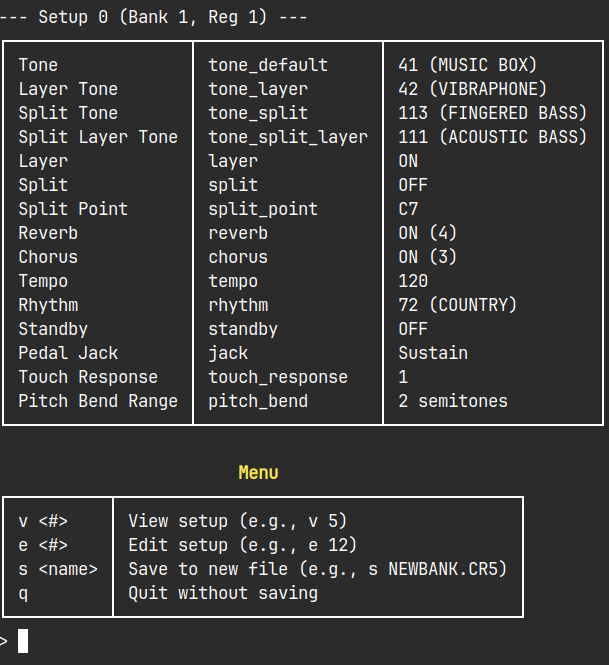 However I'm not done with the .CR5 format just yet. Since early on in the project, I wondered what would happen if I put invalid / out of range data in the file (eg. setting the tone to 800). Would the keyboard crash? Overflow or start over from 001? I've been experimenting with this recently and I've found some pretty interesting stuff, but that's a story for another day :)